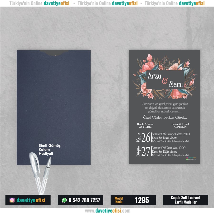Kapalı Lacivert Zarflı Modeller kategorisindeki bu ürün 28 Haziran 2024 tarihinde sitemize eklenmiştir. Bugüne kadar 3.479 ziyaretçinin incelediği bu davetiye modelini beğendiyseniz hemen sipariş verebilirsiniz.