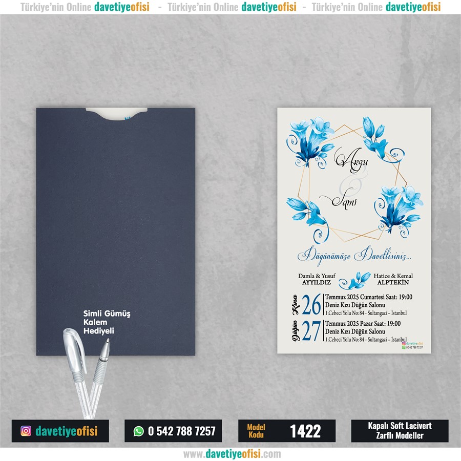 Kapalı Lacivert Zarflı Modeller kategorisindeki bu ürün 28 Haziran 2024 tarihinde sitemize eklenmiştir. Bugüne kadar 3.943 ziyaretçinin incelediği bu davetiye modelini beğendiyseniz hemen sipariş verebilirsiniz.