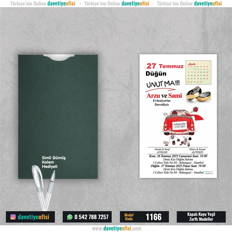 Kapalı Yeşil Zarflı Modeller kategorisindeki bu ürün 28 Haziran 2024 tarihinde sitemize eklenmiştir. Bugüne kadar 3.549 ziyaretçinin incelediği bu davetiye modelini beğendiyseniz hemen sipariş verebilirsiniz.