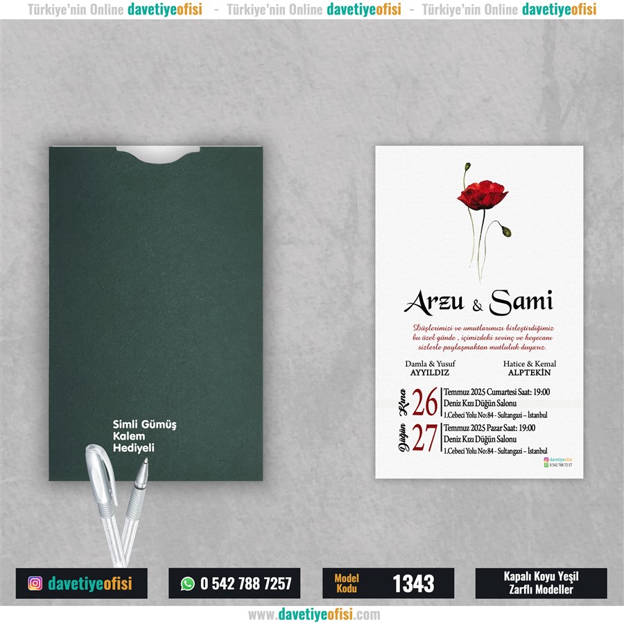 Kapalı Yeşil Zarflı Modeller kategorisindeki bu ürün 28 Haziran 2024 tarihinde sitemize eklenmiştir. Bugüne kadar 3.342 ziyaretçinin incelediği bu davetiye modelini beğendiyseniz hemen sipariş verebilirsiniz.