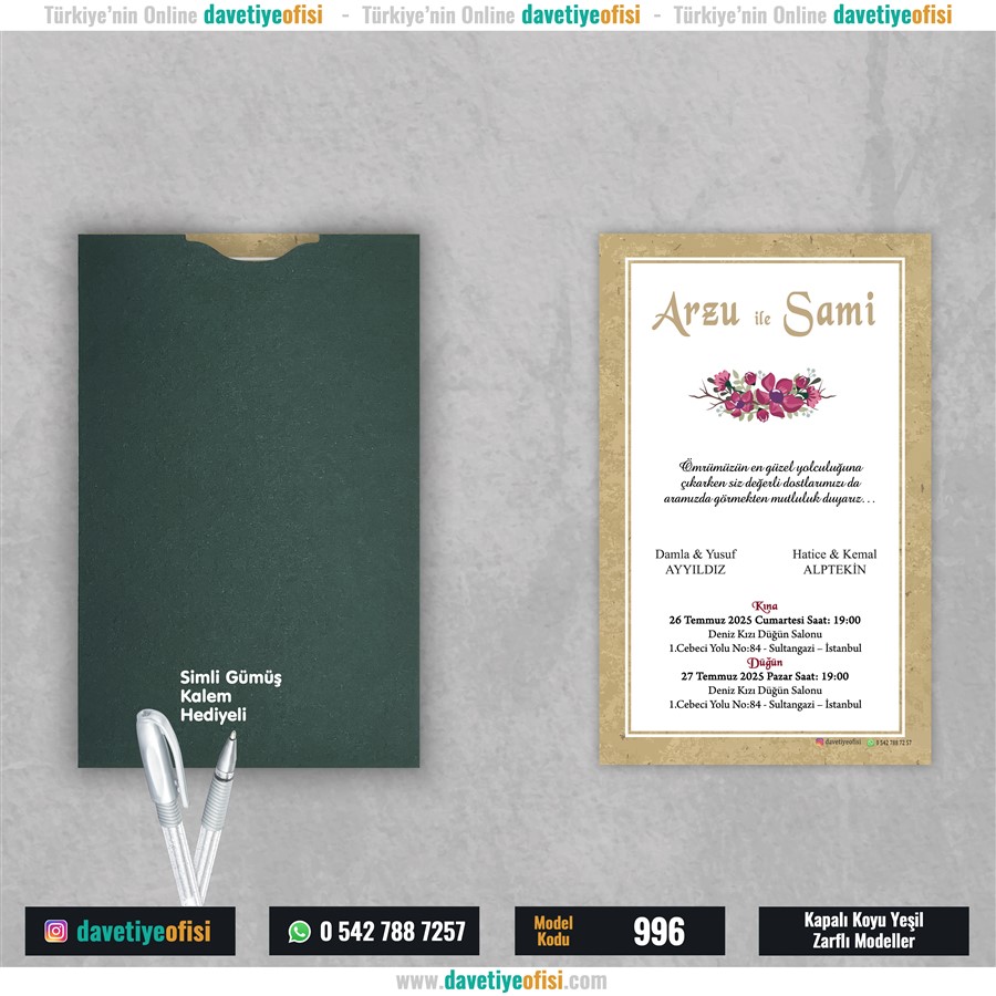 Kapalı Yeşil Zarflı Modeller kategorisindeki bu ürün 28 Haziran 2024 tarihinde sitemize eklenmiştir. Bugüne kadar 4.003 ziyaretçinin incelediği bu davetiye modelini beğendiyseniz hemen sipariş verebilirsiniz.